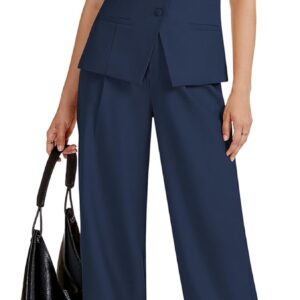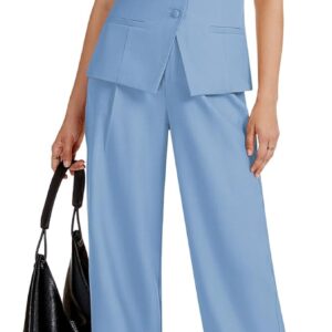 Women 2 Piece Blazer Outfits Sleeveless Crewneck Vest Wide Leg Pantsuit 2025 Dressy Casual Work Sets