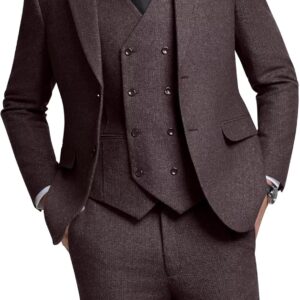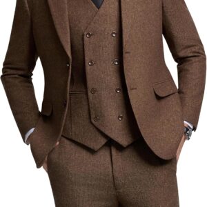 Retro 3 Piece Herringbone Tweed Suit Men's Wool Tuxedos Set Prom Brown Jacket Blazer Vest Pants Themed Wedding